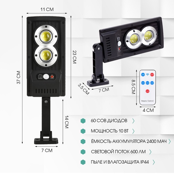 Настенный уличный фонарь, корпус которого изготовлен из ABS-пластика, имеет удобное крепление к стене, с возможностью поворота и освещением под разным углом. Благодаря работе солнечной батареи, вам не придется беспокоиться о поиске батареек. Два светодиода СОВ обеспечивают яркий и равномерный свет, делая использование фонаря комфортным и безопасным. Фонарь имеет размеры 23 х 11 см и мощность 10 Вт. Яркость света составляет 600 Люмен, что позволяет освещать большую площадь. Аккумулятор емкостью 2400 мАч обеспечивает длительное время работы устройства без подзарядки. Фонарь работает в трех режимах.