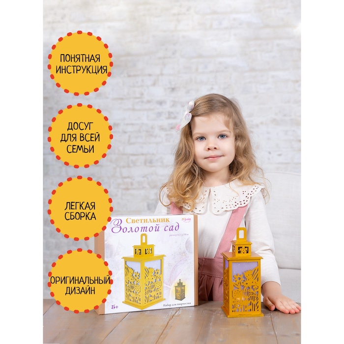 Светильник «Золотой сад» — это не просто ночник, а целый мир творчества для маленьких мечтателей! Набор идеально подходит для детей от 5 лет и позволит им самостоятельно, или с небольшой помощью взрослых, собрать удивительный светильник в форме старинного фонаря с узорами прекрасного цветочного сада.