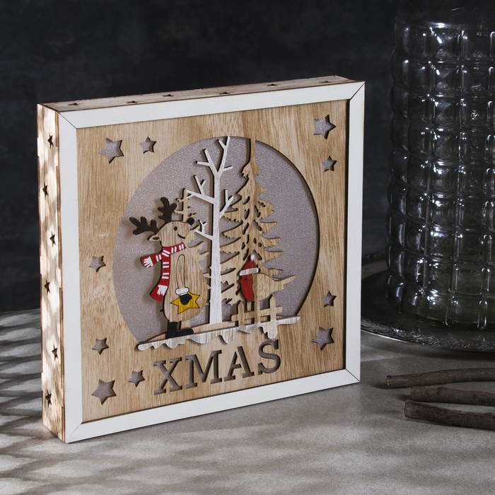 Светодиодная фигура «Олень и снегирь» 22 × 22 × 4 см, дерево, батарейки АААх2 (не в комплекте), свечение тёплое белое