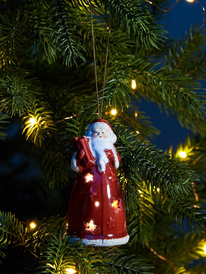 Светодиодный подвес «Дед Мороз» станет идеальным праздничным украшением для вашей новогодней ёлки. В миниатюрной керамической форме он излучает тёплый белый свет, создавая уютную атмосферу. Уникальный декор привнесёт радость и немного волшебства в ваш дом благодаря своему мерцающему сиянию, работающему от батареек.