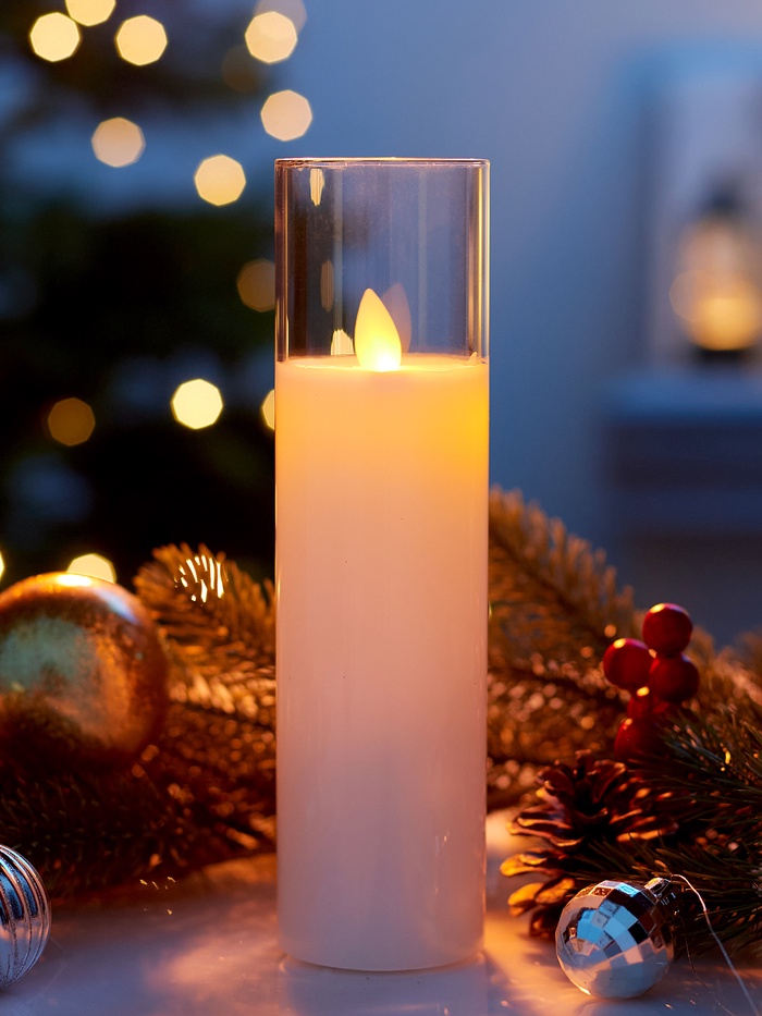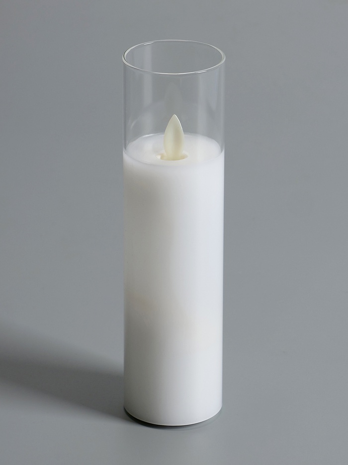 Белоснежная светодиодная восковая свеча в прозрачном стакане создаёт атмосферу спокойствия и уюта, идеально вписываясь в любой интерьер. Её классическая цилиндрическая форма и высота 20 см делают изделие универсальным решением для оформления домашнего пространства, ресторанов или праздничных мероприятий.