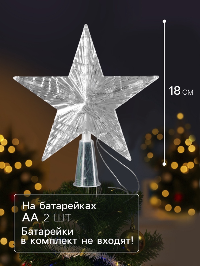 - Питание: Работает от двух батареек типа AA (не входят в комплект), что позволяет легко установить её на елку без необходимости в розетке.