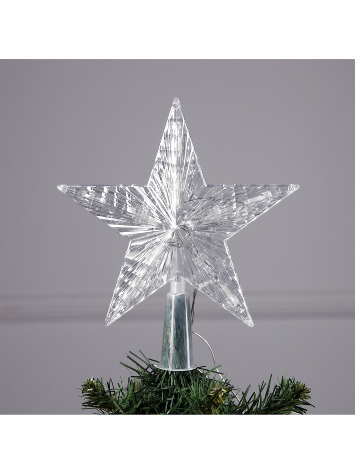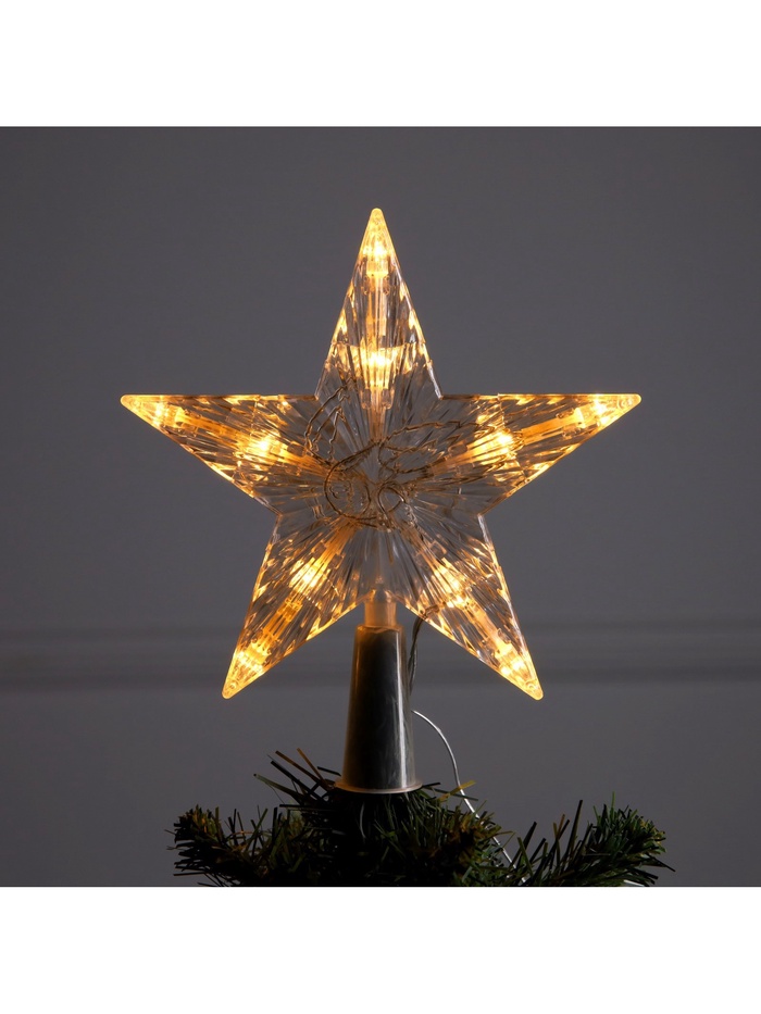 Эта верхушка выполнена из прозрачного пластика, что делает её лёгкой и удобной для установки на любую ёлку. Благодаря 10 светодиодам с тёплым белым свечением, она создает потрясающий визуальный эффект, который понравится как детям, так и взрослым. Верхушка работает от двух батареек типа AA (не входят в комплект), что обеспечивает её автономность и удобство использования.