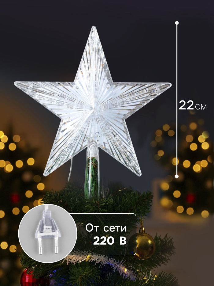 Яркая звезда на верхушке – главное украшение новогодней ёлки! Пусть этот классический элемент декора засияет по-новому! Работающая от сети 240V, светящаяся звезда-верхушка станет идеальным завершающим штрихом в убранстве вашей ёлки. Традиционная красная или под цвет игрушек, таинственная с мягким светом или яркая, переливающаяся – решать только вам!