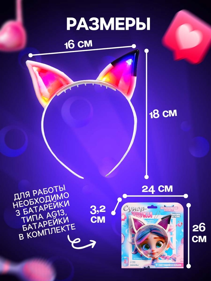 Ободок с ушками «Супер-ушки» — стильный аксессуар для девочек от 3 лет, который превратит любое событие в яркое и весёлое приключение. Красивые светящиеся ушки, звуковые эффекты и удобная конструкция подарят ребёнку яркие эмоции и хорошее настроение.