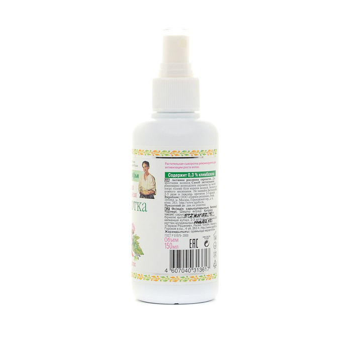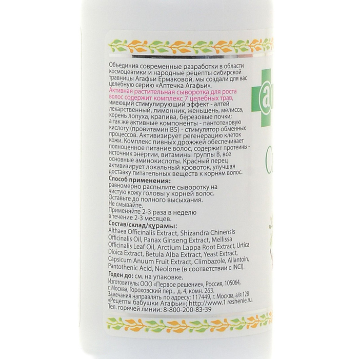 Активная растительная сыворотка для роста волос содержит в своем составе комплекс 7 целебных трав, имеющий стимулирующий эффект – алтей лекарственный, лимонник, женьшень, мелисса, корень лопуха, крапива, березовые поч-ки; а также активные компоненты - пантотеновая кислота (провитамин В5), комплекс пивных дрожжей, вытяжка красного перца, климбазол. Пантотеновая кислота (провитамин В5) - стимулятор обменных процессов. Активизирует регенерацию клеток кожи. Комплекс пивных дрожжей – обеспечивает полноценное питание волос, содержит протеины – источник энергии, витамины группы B , все основные аминокислоты. Красный перец - активизирует локальный кровоток, улучшая доставку питательных веществ к корням волос. Растительная сыворотка рекомендуется для активизации роста волос.