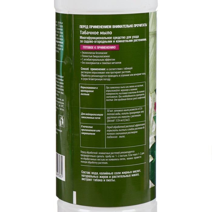 Табачное мыло - природное средство для защиты комнатных и садовых растений от болезней и вредителей. Экстракт табака усиливает губительный для насекомых эффект препарата являясь при этом безопасным для человека. Пихтовый экстракт, входящий в состав мыла, активизирует иммунитет, повышает устойчивость растений к болезням и, тем самым повышая урожайность.
