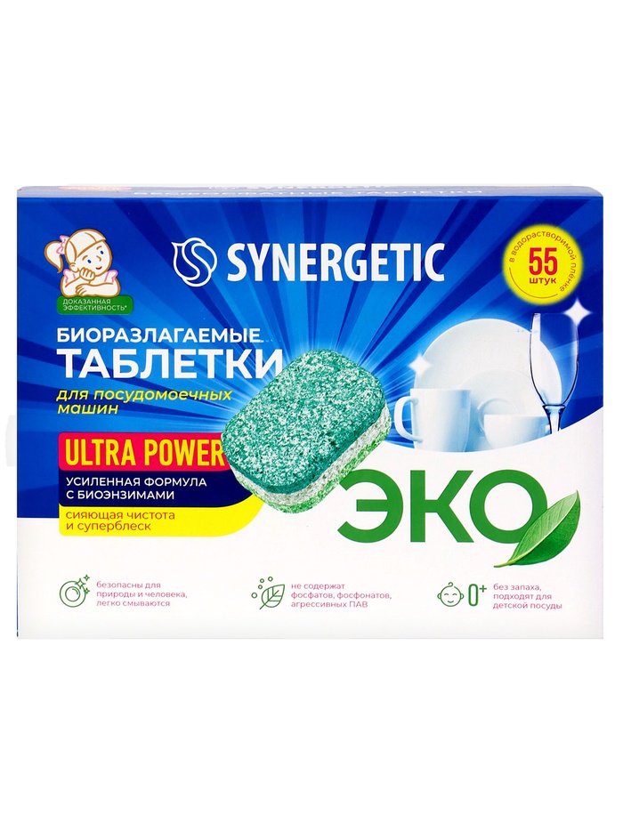 Биоразлагаемые бесфосфатные таблетки для посудомоечных машин SYNERGETIC ULTRA POWER в водорастворимой плёнке - это экологичное, безопасное и эффективное средство.