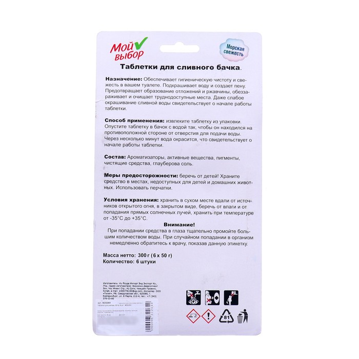 Применение: Выньте таблетку из упаковки и не снимая защитную пленку поместите в бачок унитаза подальше от сливного отверстия.