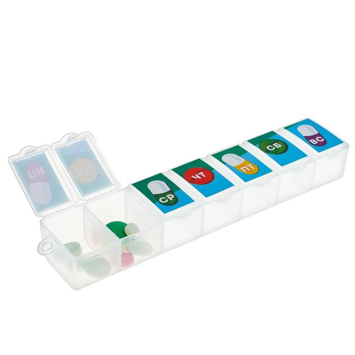 Компактный органайзер изготовлен из пластика безопасного для использования. Предназначен для хранения витаминов и таблеток.Контейнер для таблеток на день послужит компактной аптечкой, которую можно взять на работу,в отпуск,в командировку или для поездки загород на несколько дней. Контейнер органайзер для таблеток подойдет активным людям, которым необходимо принимать лекарства несколько раз в день или же несколько дней подряд вне дома.