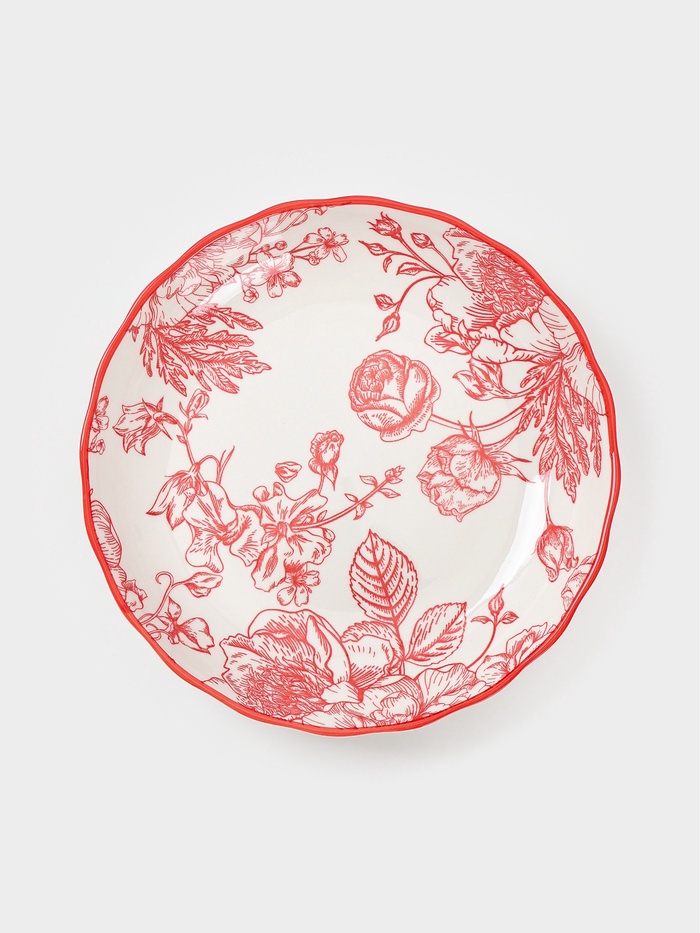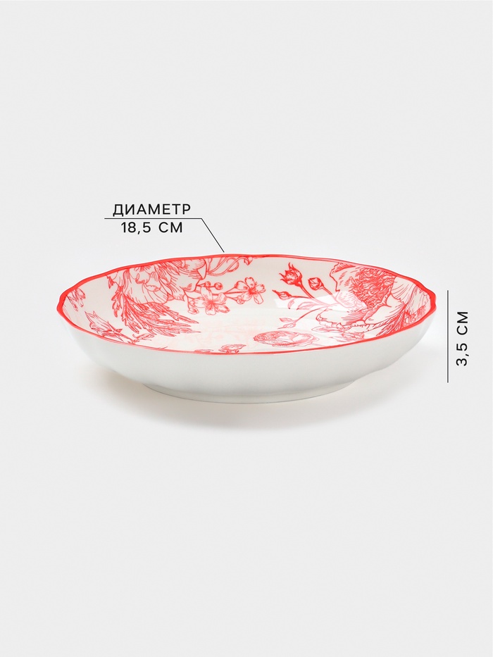 Плоская фарфоровая тарелка Botanica диаметром 18,5 см — лаконичный выбор для тех, кто ищет изящную посуду с характером. Белый фон подчёркивает насыщенный красный растительный орнамент, выполненный в технике деколи, а компактный формат делает изделие универсальным: от завтрака до лёгкого ужина или стильной подачи закусок. Гладкая глазурованная поверхность сохраняет блеск даже после многократного использования.