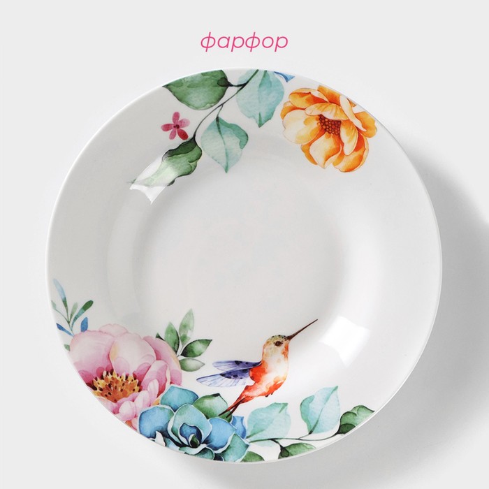 Тарелка суповая Доляна «Пташка» изготовлена из качественного костяного фарфора. Такая посуда не только тоньше, но и заметно легче, чем аналогичные изделия из обычного фарфора. Благодаря оригинальному дизайну изделие легко украсит вашу кухню, а также прекрасно подойдёт в качестве подарка. Тарелка выполнена в приятных тонах, что позволит вписать её практически в любой интерьер.