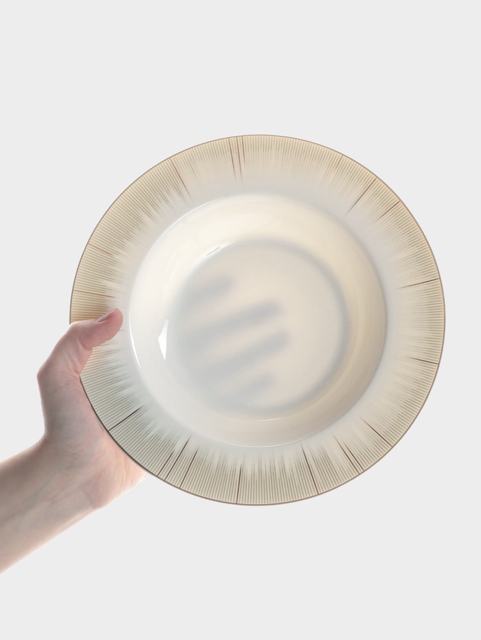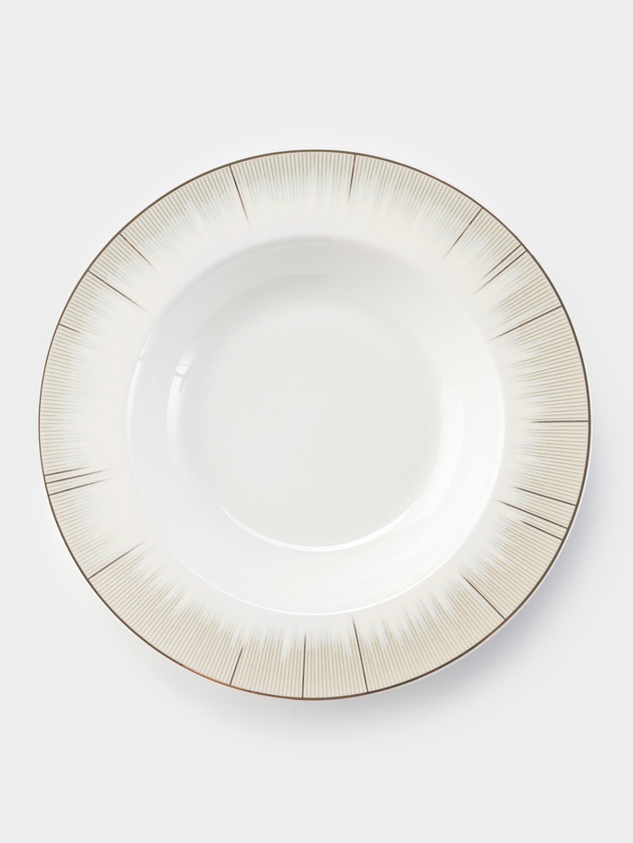 Эта глубокая тарелка - не просто посуда, а настоящее произведение искусства. Изготовленная из тонкого костяного фарфора, она легка и элегантна. Золотая отводка придает ей особый шарм и делает ее идеальной для подачи любимых блюд. Бережная ручная мойка сохранит красоту изделия на долгие годы, напоминая о тепле ваших рук.