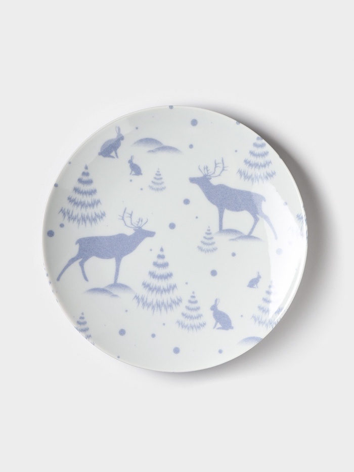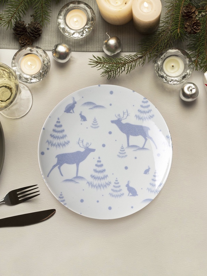 Плоская фарфоровая тарелка диаметром 24 см с новогодним рисунком «Зимний лес» создаёт праздничное настроение за столом. Изображение заснеженных деревьев и лесных обитателей на белом фоне напоминает о прогулках по зимнему парку и делает сервировку особенной.