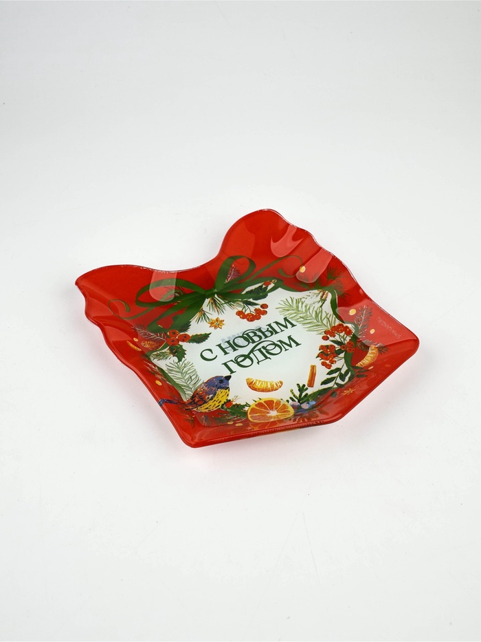 Новогодняя стеклянная тарелка в форме подарка — идеальный выбор для сервировки стола.