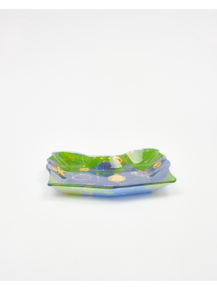 Новогодняя стеклянная тарелка в форме подарка — идеальный выбор для сервировки стола.