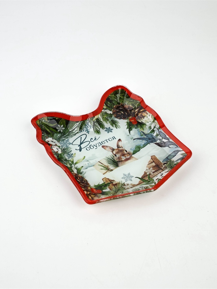Новогодняя стеклянная тарелка в форме подарка — идеальный выбор для сервировки стола.