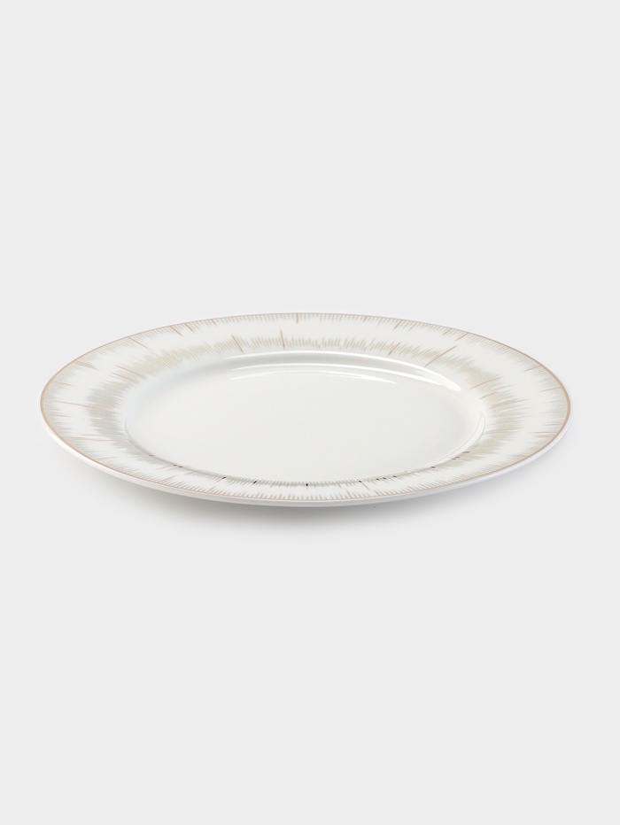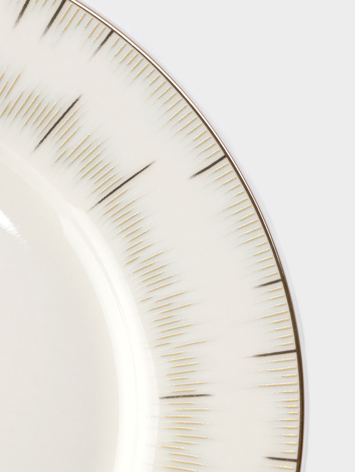 Эта тарелка - не просто предмет посуды, а настоящее украшение вашего стола. Изготовленная из тонкого костяного фарфора, она легка и изящна. Золотая отводка придает ей особый шарм и делает ее идеальной для особых случаев. Бережная ручная мойка позволит сохранить красоту изделия на долгие годы, напоминая о ценности момента.