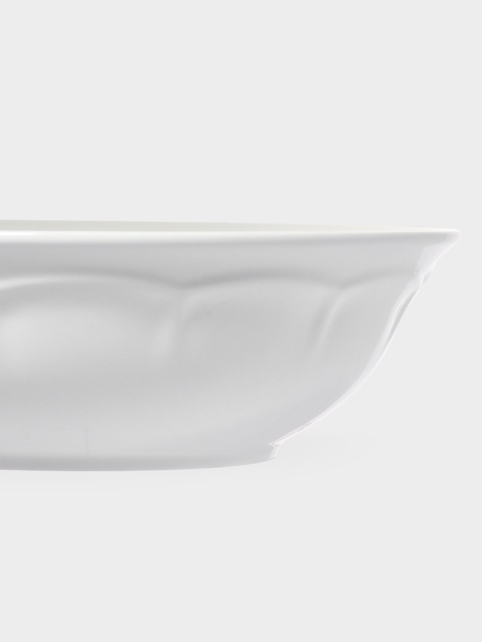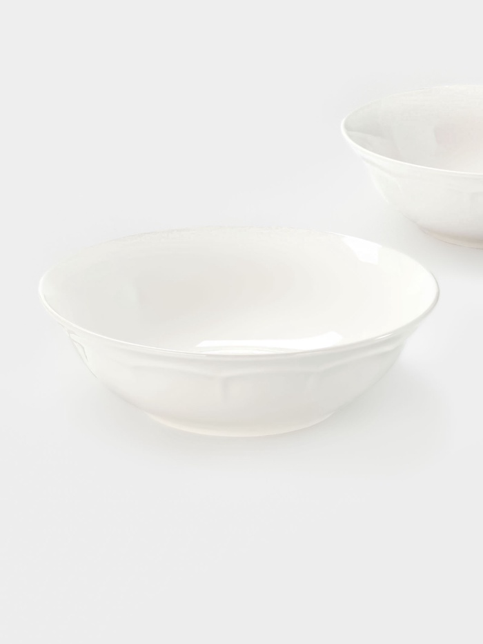Подавайте ваши любимые супы и другие первые блюда в этих изысканных белых фарфоровых тарелках. Набор включает две глубокие тарелки диаметром 22.5 см и объемом 850 мл каждая, выполненные из нового костяного фарфора с изящным рельефным узором. Тарелки пригодны для использования в микроволновой печи и посудомоечной машине.