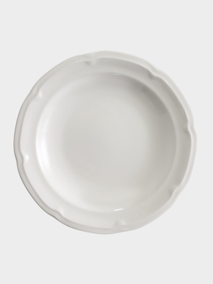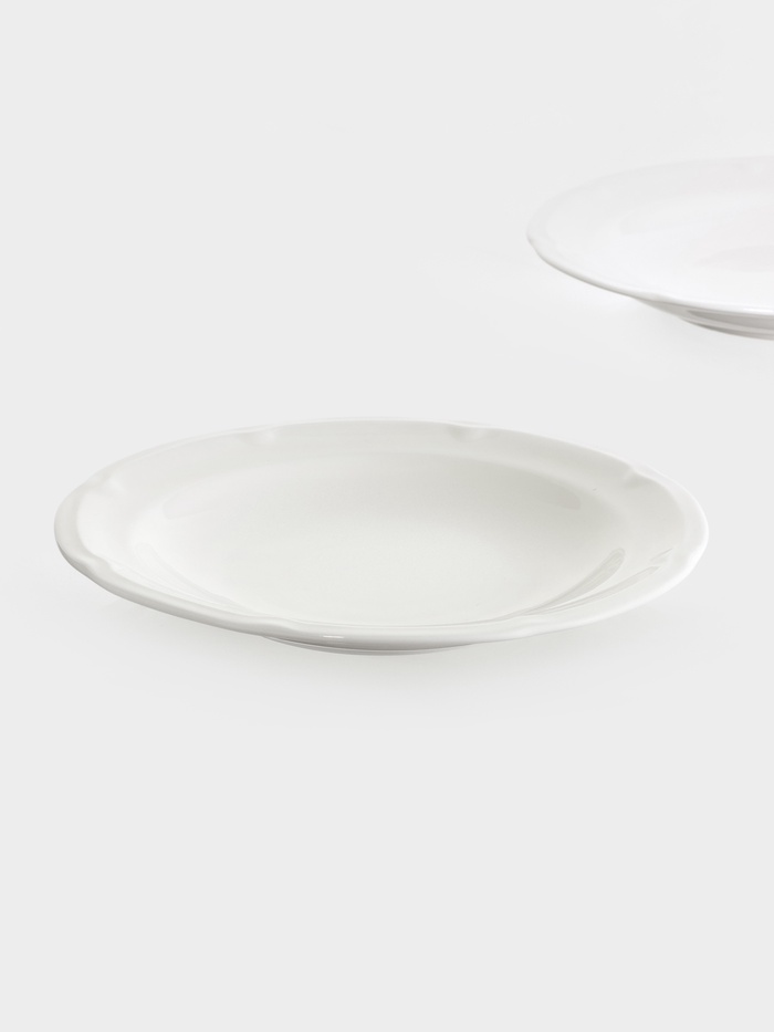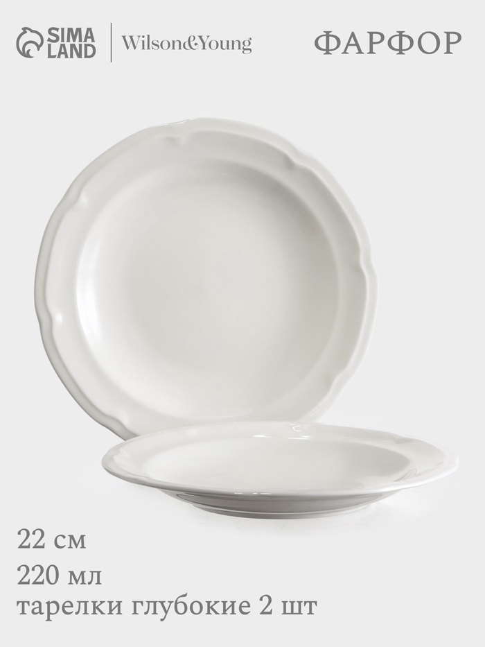 Набор из двух белых фарфоровых тарелок объемом 220 мл и диаметром 22 см. Отличительной особенностью является рельефная текстура и барельефный декор, придающий им особый шарм. Идеальны для подачи супов-пюре, соусов, десертов или небольших порций салатов. Можно использовать в микроволновой печи и мыть в посудомоечной машине.