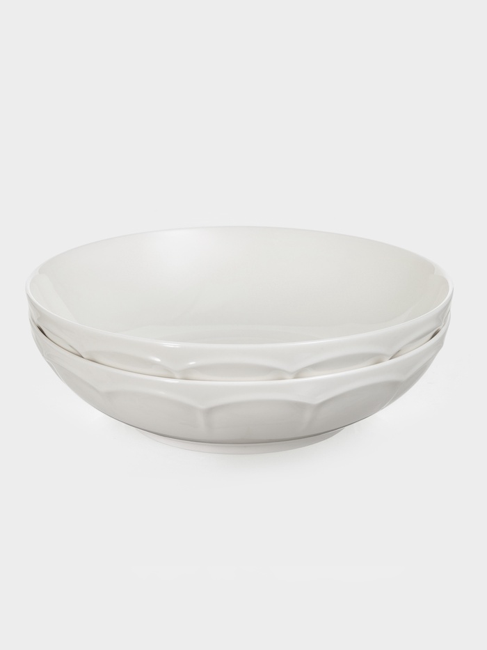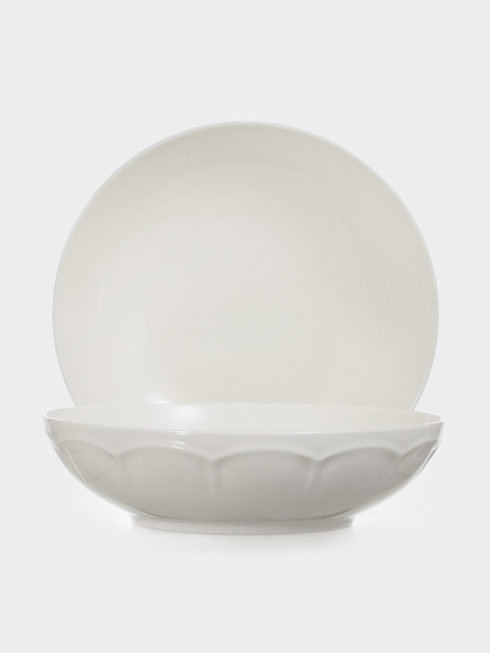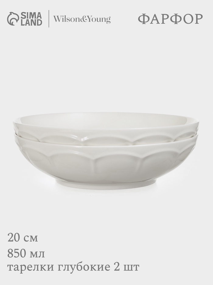Представляем набор из двух глубоких тарелок объемом 850 мл и диаметром 20 см, выполненных из белого фарфора. Рельефная текстура и изысканный барельеф придают этим тарелкам неповторимый шарм. Подходят для подачи супов, бульонов и других первых блюд. Можно использовать в микроволновой печи и мыть в посудомоечной машине.