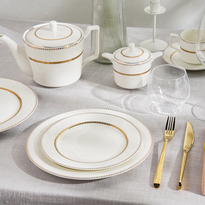 - Элегантный дизайн: белоснежный фарфор с нежным рисунком и золотой отделкой.