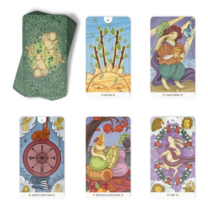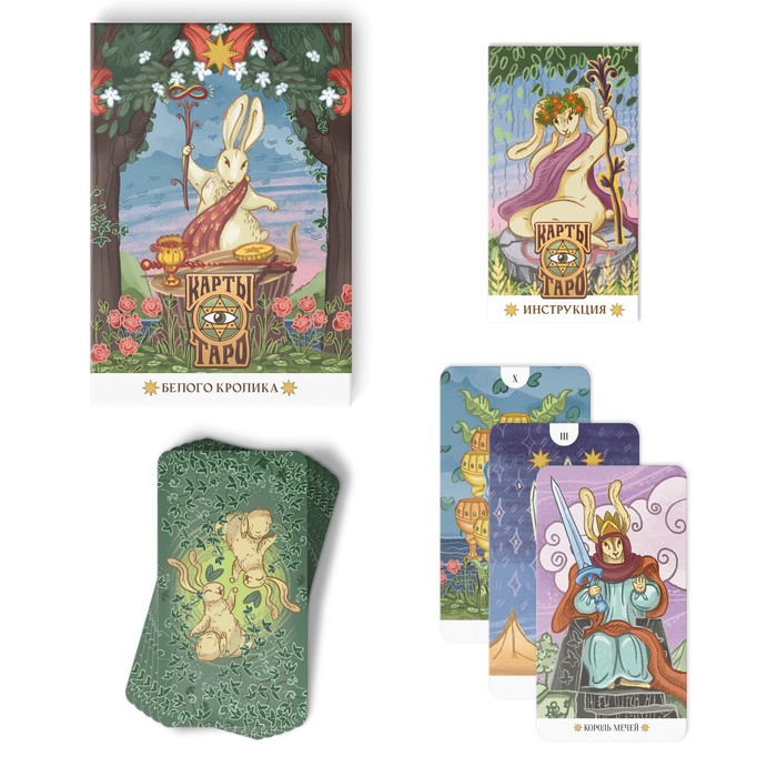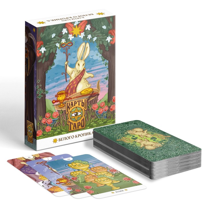 Карты «Таро Белого кролика» выполнены по методике Райдера – Уэйта. Каждая из них содержит авторские иллюстрации с подробными сюжетами. С их помощью вы погрузитесь в удивительный мир Таро и получите заветные ответы на вопросы: самопознания, судьбы, ролей и будущего. Вас ждет 78 карт с яркими иллюстрациями. Их героем стал белый кролик – ваш оракул и символ возрождения, ловкости и магической силы.