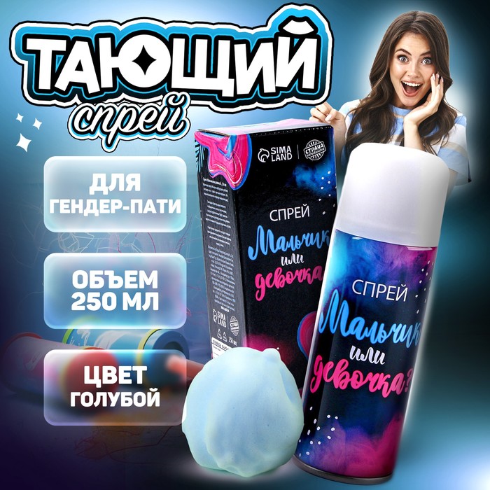 Тающий спрей поможет в организации самого яркого и незабываемого праздника. Достаточно распылить спрей и по цвету наполнителя Вы узнаете пол будущего ребёнка! А чтобы убедиться, что вам пришел верный цвет, на баллончике есть обозначение снизу: 1 - девочка; 2 – мальчик. Спрей является безопасным для использования в любом помещении или на улице.