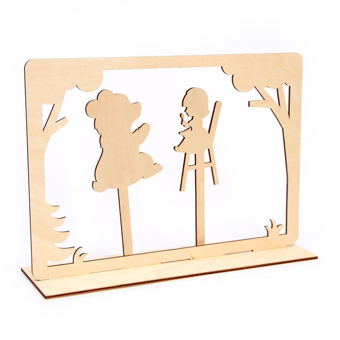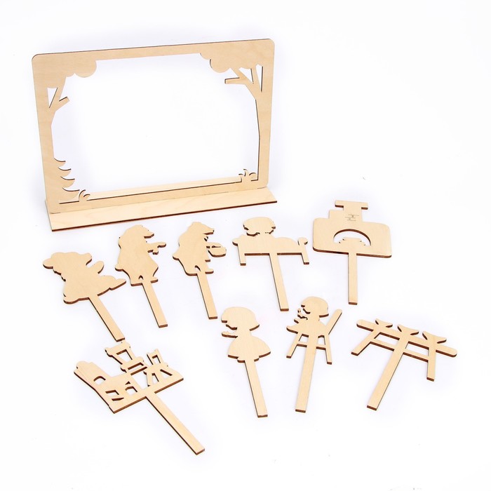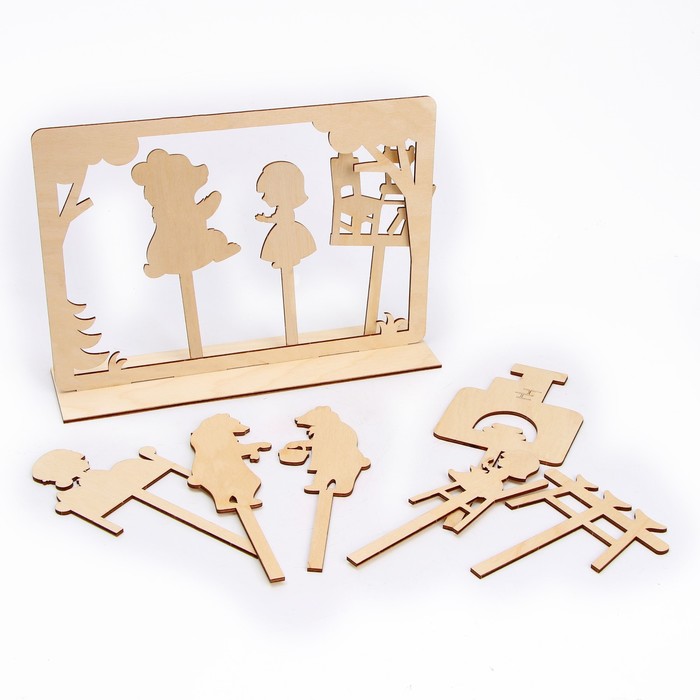 - В комплекте деревянные фигурки героев и сборная ширма для создания теней.