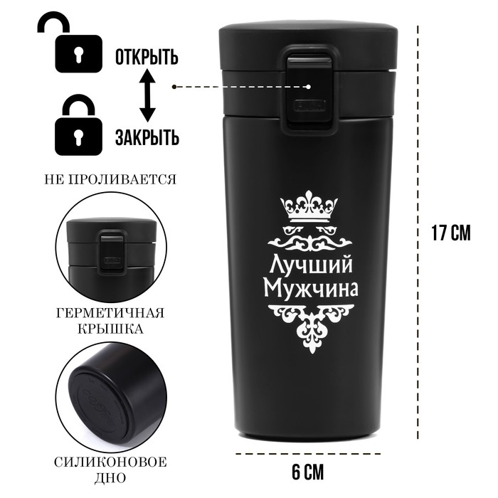Термокружка для кофе и чая "Мастер К" идеальна для офиса, автомобиля, длительных прогулок и детям в школу. Благодаря специальному покрытию надежно лежит в руке.