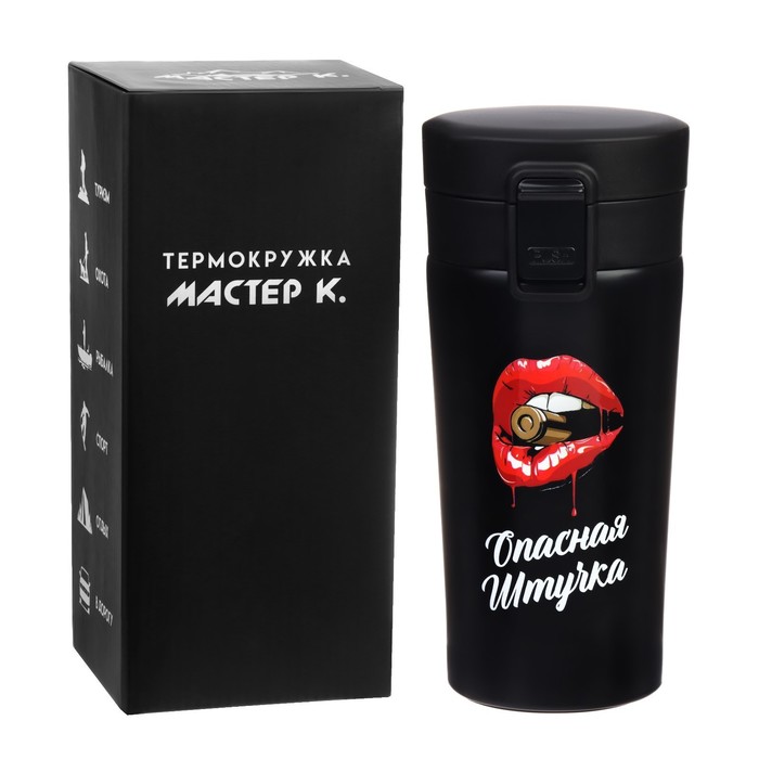 Термокружка для кофе и чая "Мастер К" идеальна для офиса, автомобиля, длительных прогулок и детям в школу. Благодаря специальному покрытию надежно лежит в руке.