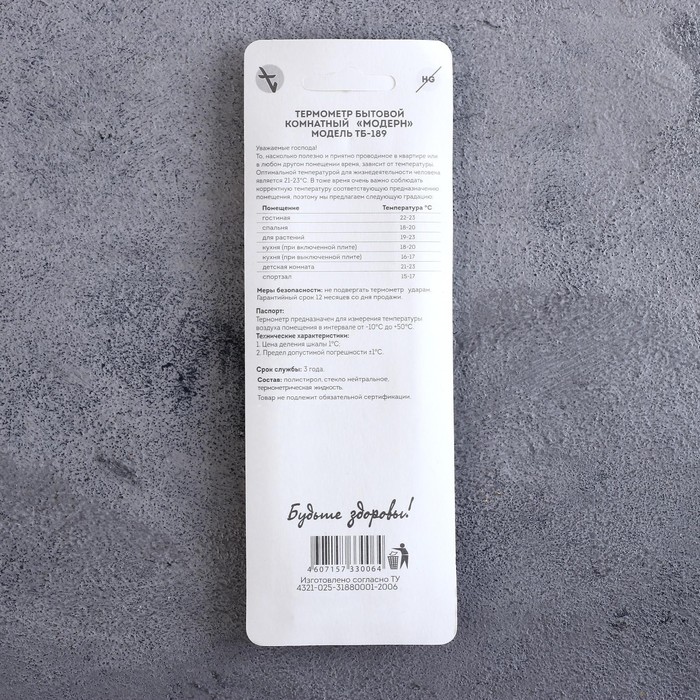 Термометр предназначен для определения температуры воздуха внутри помещения. Изделие не содержит ртути, поэтому оно безопасно для использования в быту. Прибор отображает значения по шкале Цельсия.