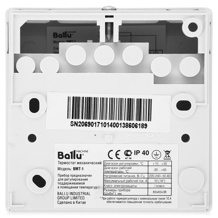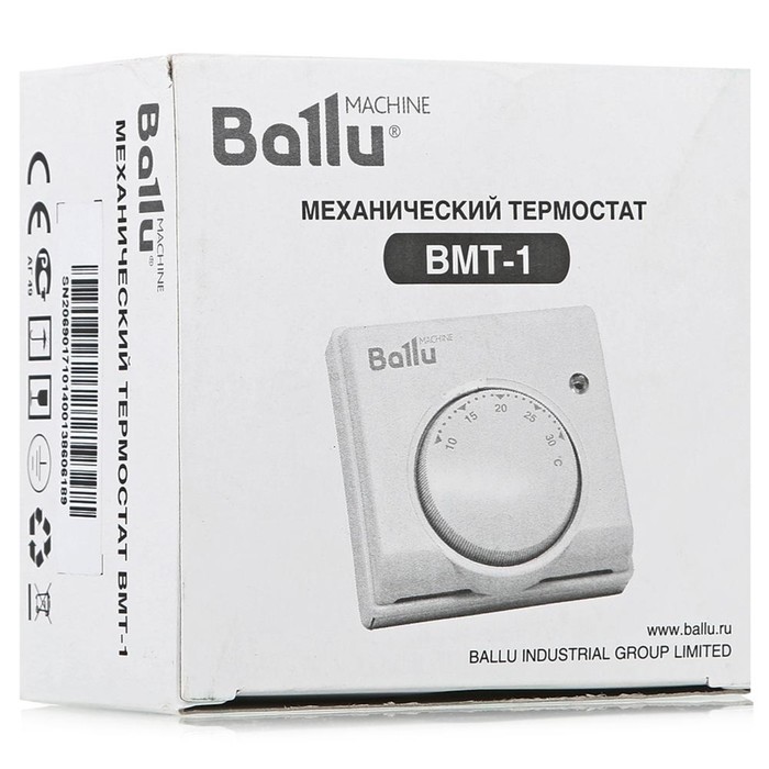 Накладной терморегулятор BALLU BMT-1 используется для автоматического поддержания заданной температуры. Предназначен для инфракрасных обогревателей BALLU серий BIH-AP и BIH-T мощностью до 2 кВт.