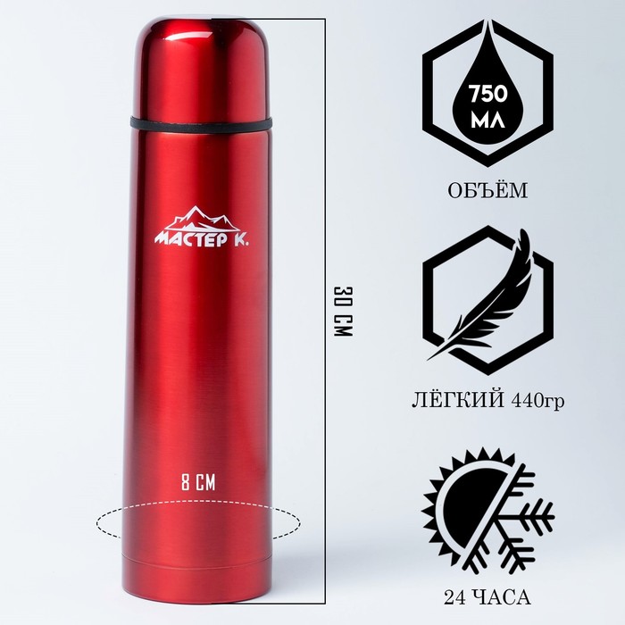 Термос 750 мл "Мастер К" изготовлен из высококачественной нержавеющей стали, имеет двойные стенки, обеспечивающих вакуумную термоизоляцию. Легкий и прочный термос "Мастер К" сохранит ваши напитки горячими или холодными надолго. Это идеальный выбор для тех, кто хочет наслаждаться горячими напитками во время отдыха на природе или в поездках, напиток останется теплым и свежим, готовым к наслаждению в любой момент. Термосы этой серии пользуются большой популярностью у активных и динамичных пользователей, а также у любителей охоты и рыбалки, так как они, сохраняют прочность и термоустойчивость, легки и компактны.