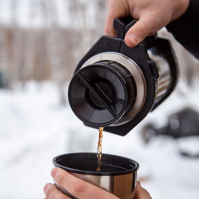 - Наливается напиток в крышку-чашку, достаточно повернуть резьбовую пробку вполоборота.