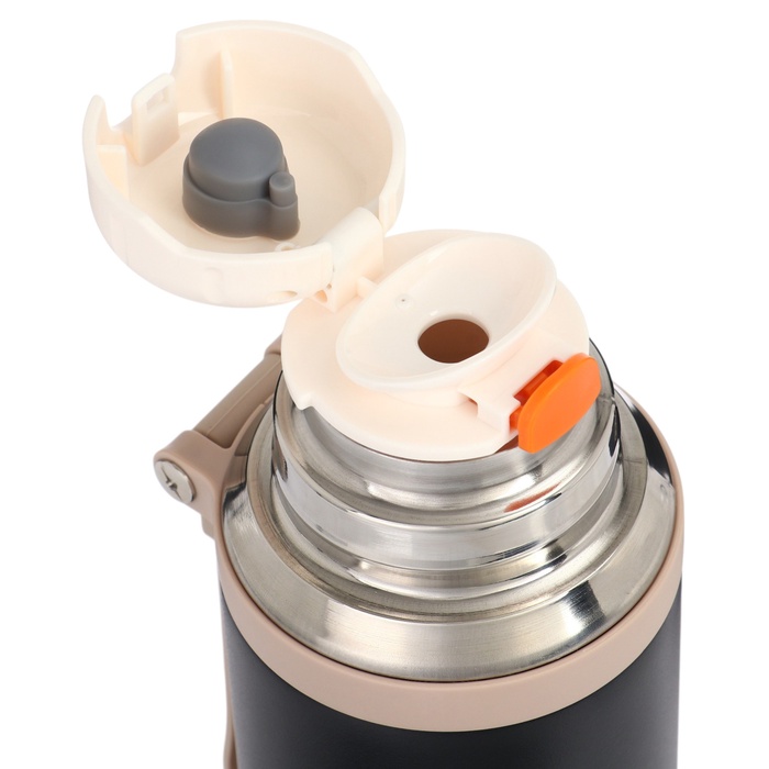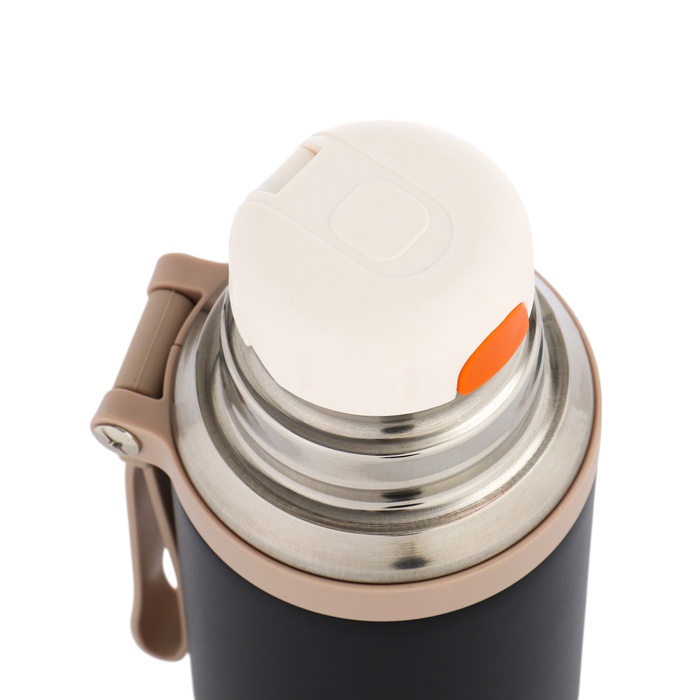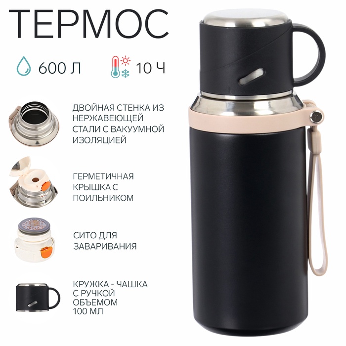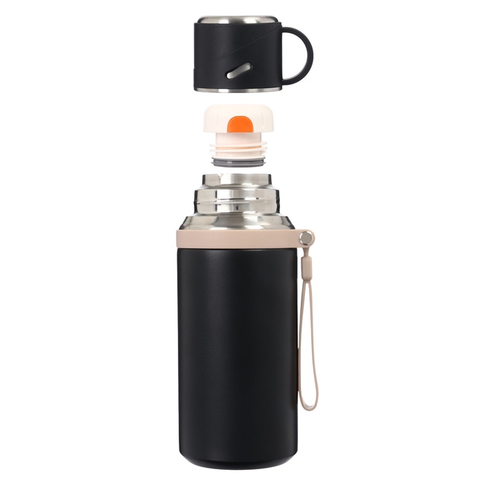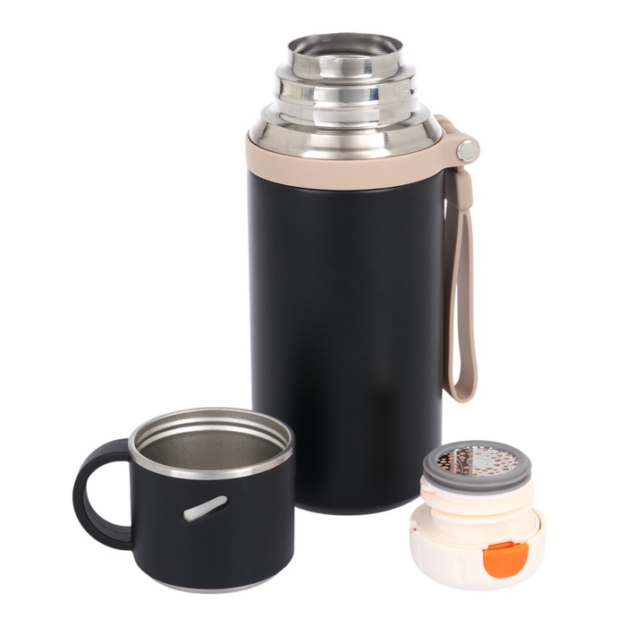 - Комфорт в использовании: Термос оснащен удобной ручкой и силиконовым ремешком для комфортной переноски.