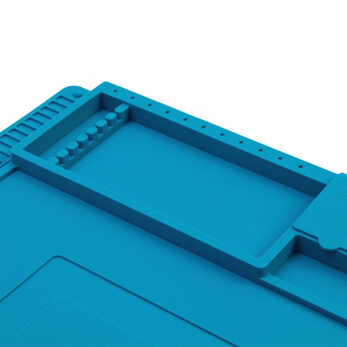 На коврике есть отсеки для размещения инструментов, хранения мелких деталей и специальные отсеки с магнитным основанием для фиксации винтов.