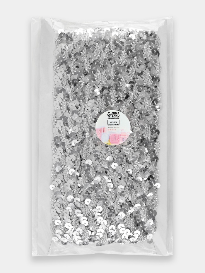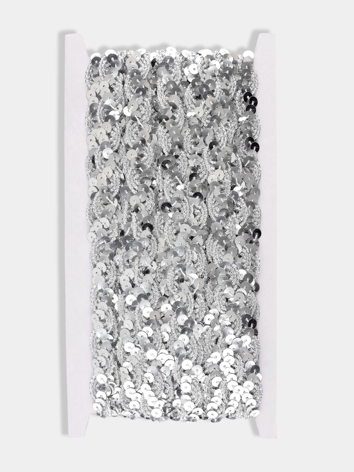 Серебряная пайеточная тесьма добавляет мерцающий акцент в женские проекты. Узкий профиль подходит для деликатной отделки, создавая ровную линию блеска без перегрузки. Девяти метров хватит для оформления одежды, аксессуаров или декоративных элементов, где важна точность.
