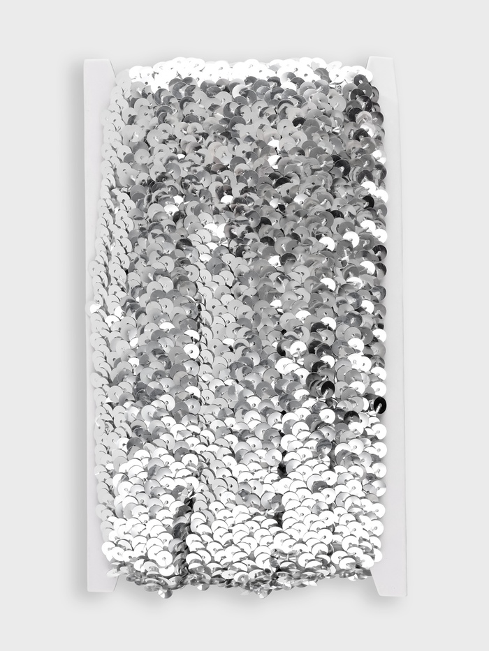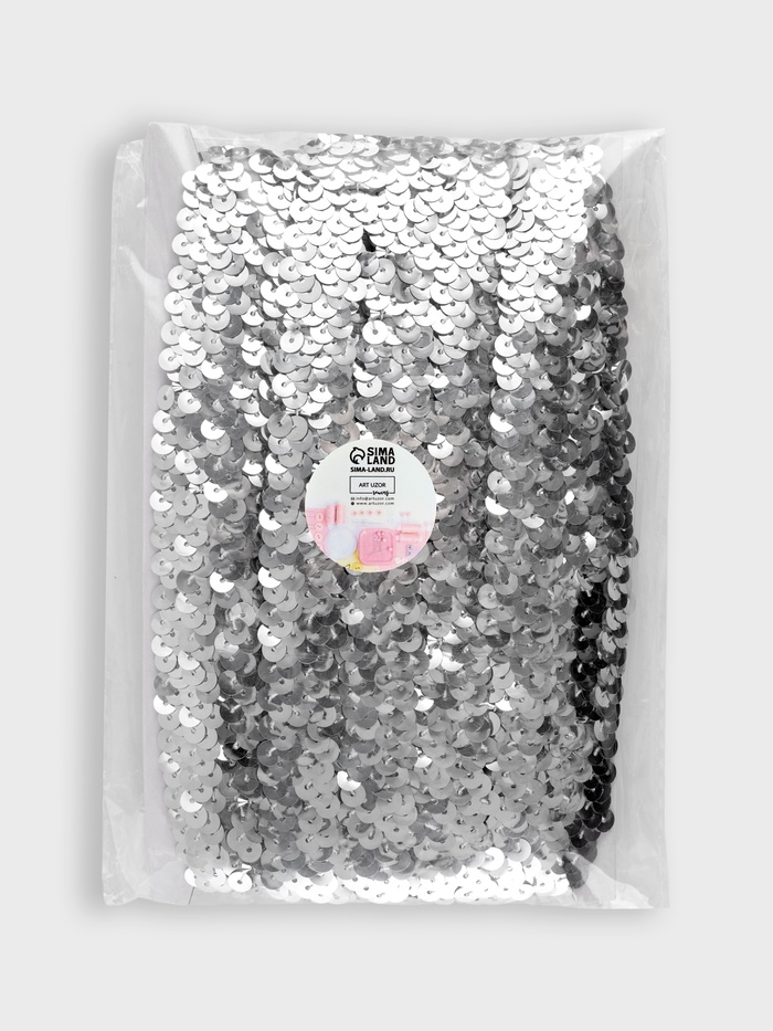 Серебряная эластичная тесьма с пайетками создаёт подвижное мерцание на изгибах и складках. Резиновая основа плотно облегает сложные формы, сохраняя равномерное распределение блёсток при растяжении. Девяти метров хватит для отделки манжет, воротников или создания декоративных акцентов на текстиле.