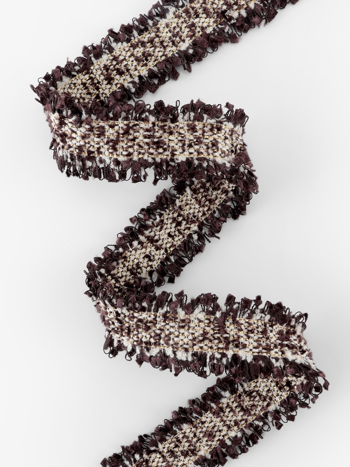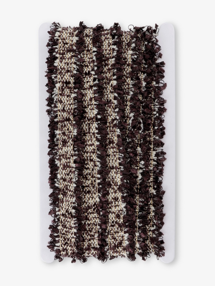 Коричневая твидовая тесьма — классическая отделка для создания стильных акцентов. Её натуральный оттенок и двусторонняя фактура напоминают текстуру шерстяной ткани. Широкая 30-миллиметровая полоса подчеркивает декоративный эффект.