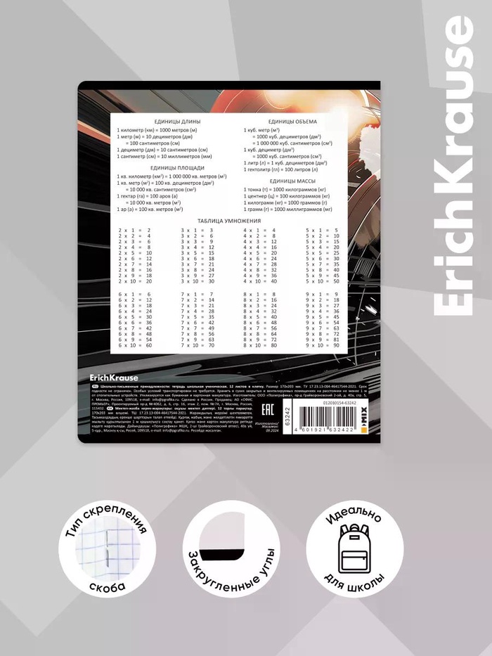Тетрадь школьная ученическая формата А5+ (170х203 мм). Обложка из высококачественного мелованного картона плотностью 170 г/м2. В блоке 12 листов в клетку с полями. Бумага офсетная плотностью 60 г/м2. Цвет линовки - синий. Скругленные уголки обложки и блока. Тип скрепления - скоба.