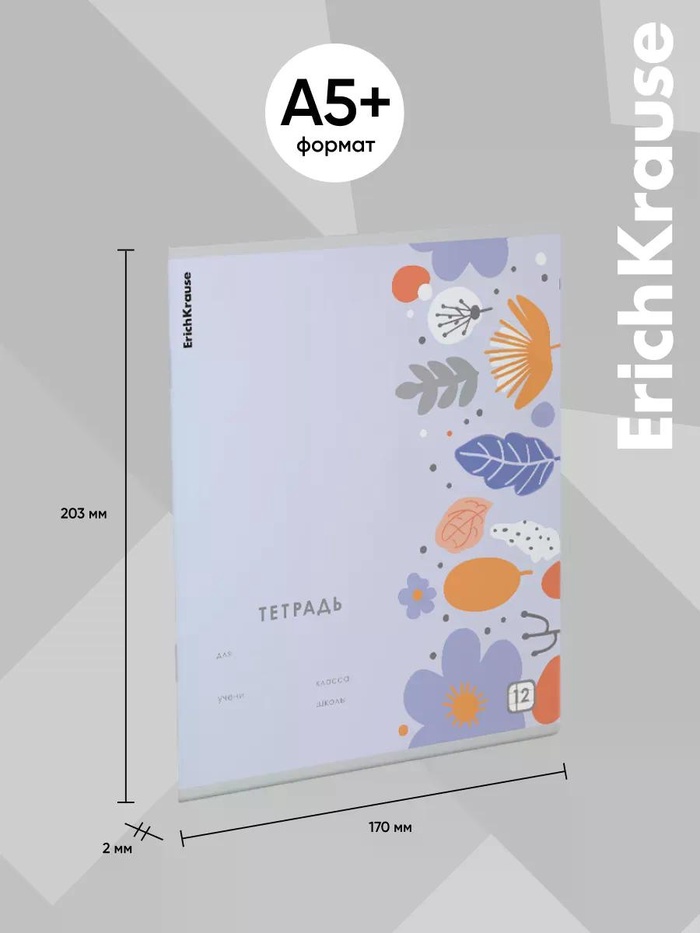 Тетрадь школьная ученическая формата А5+ (170х203 мм). Обложка из высококачественного мелованного картона плотностью 170 г/м2. В блоке 12 листов в клетку с полями. Бумага офсетная плотностью 60 г/м2. Цвет линовки - синий. Скругленные уголки обложки и блока. Тип скрепления - скоба.