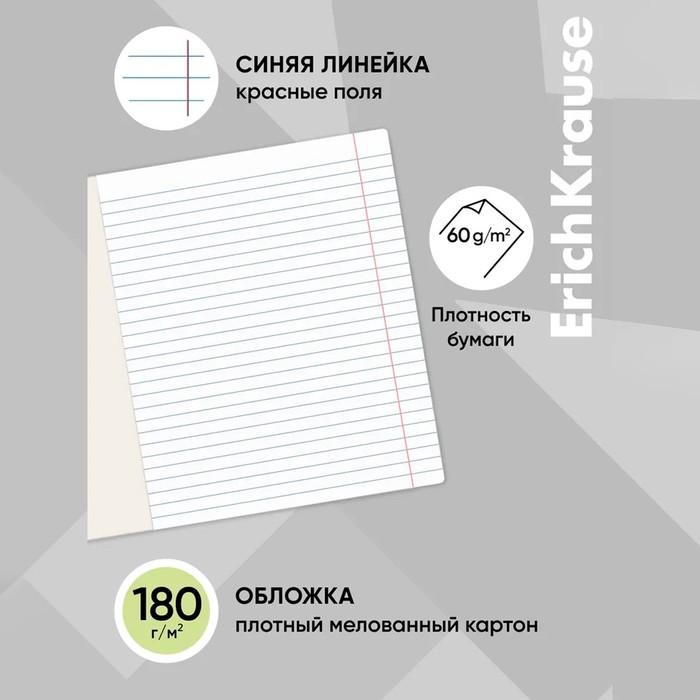 Тетрадь общая формата А5+ (170х203 мм). Обложка из высококачественного мелованного картона плотностью 180 г/м2. В блоке 12 листов в линейку с полями. Бумага офсетная плотностью 60 г/м2. Цвет линовки - синий. Скругленные уголки обложки и блока. Тип скрепления - скоба. Тетради разных цветов упакованы в термоусадочную пленку по 10 штук.