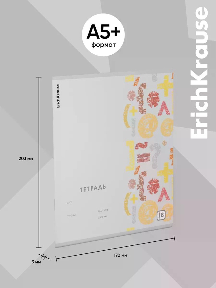 Тетрадь школьная ученическая формата А5+ (170х203 мм). Обложка из высококачественного мелованного картона плотностью 170 г/м2. В блоке 18 листов в клетку с полями. Бумага офсетная плотностью 60 г/м2. Цвет линовки - синий. Скругленные уголки обложки и блока. Тип скрепления - скоба.