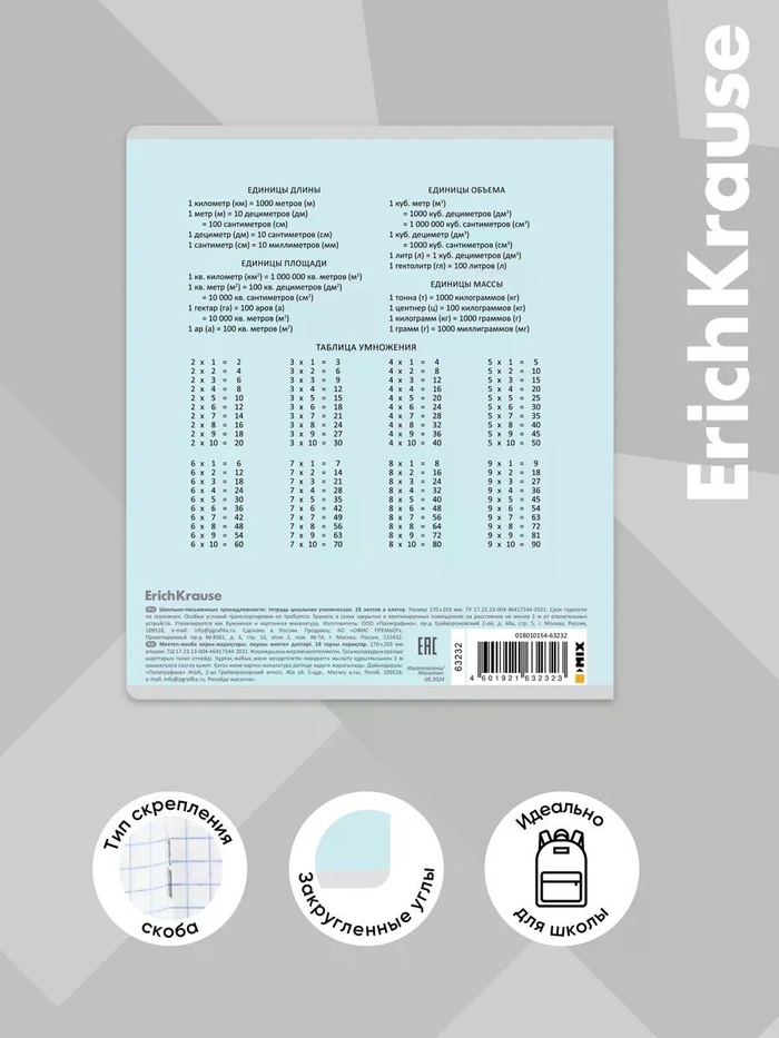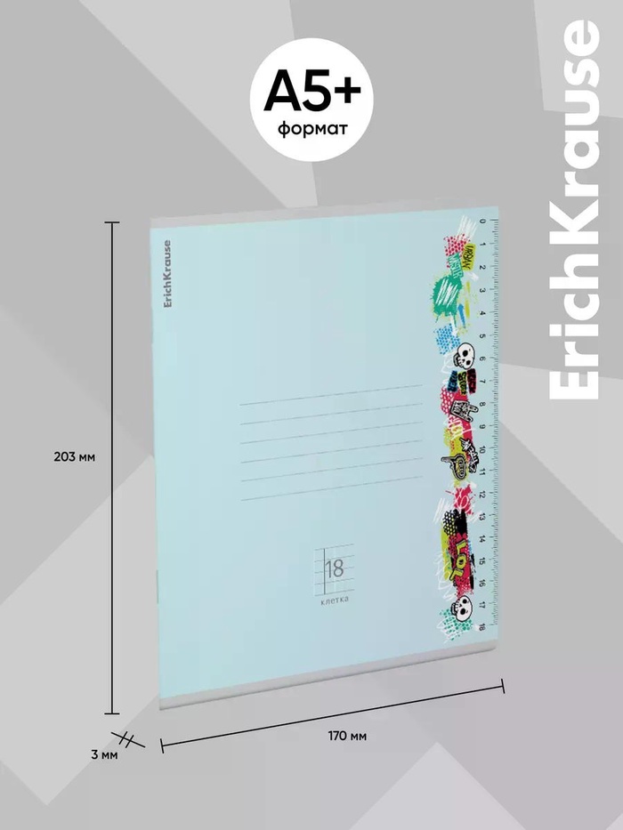 Тетрадь школьная ученическая формата А5+ (170х203 мм). Обложка из высококачественного мелованного картона плотностью 170 г/м2. В блоке 18 листов в клетку с полями. Бумага офсетная плотностью 60 г/м2. Цвет линовки - синий. Скругленные уголки обложки и блока. Тип скрепления - скоба.