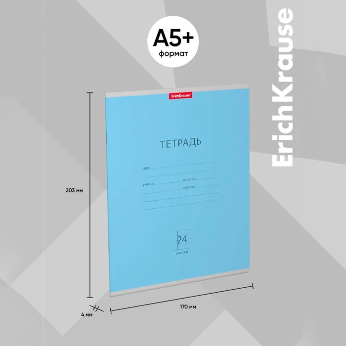Тетрадь школьная ученическая формата А5+ (170 х 203 мм). Обложка из высококачественного мелованного картона плотностью 180 г/м2. В блоке 24 листа в клетку с полями. Бумага офсетная плотностью 60 г/м2. Цвет линовки - синий. Скругленные уголки обложки и блока. Тип скрепления - скоба. Тетради упакованы в термоусадочную пленку по 10 штук.