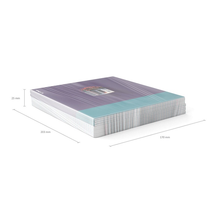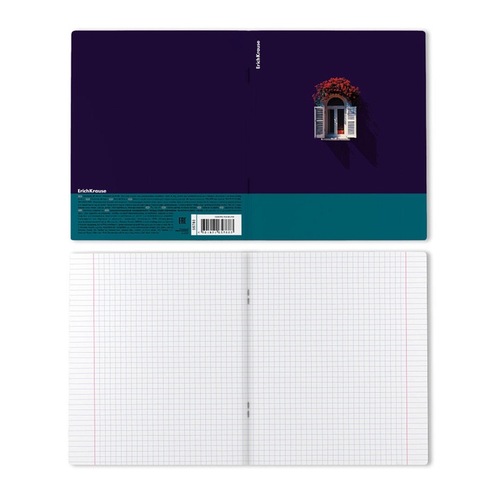 Тетрадь общая ученическая формата А5+ (170x203 мм). Двойная обложка: внешняя выполнена из высококачественного износостойкого прозрачного пластика с фактурой «апельсиновая корка», внутренняя — из качественной мелованной бумаги. В блоке 48 листов в клетку. Бумага офсетная плотностью 60 г/м2. Цвет линовки — синий. Скругленные уголки обложки и блока. Тип скрепления — скоба.