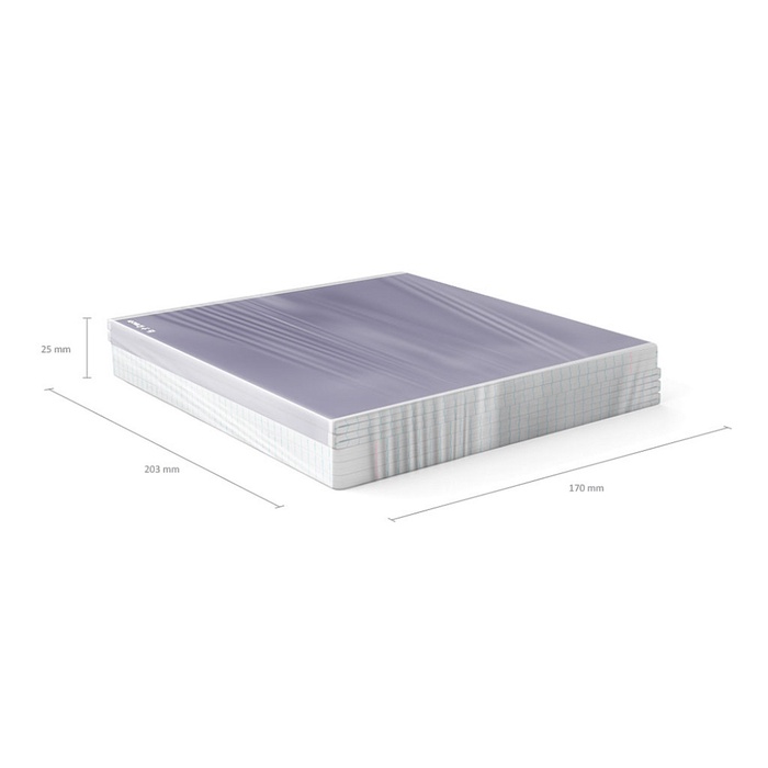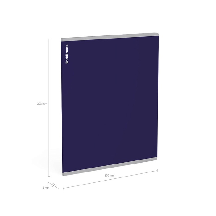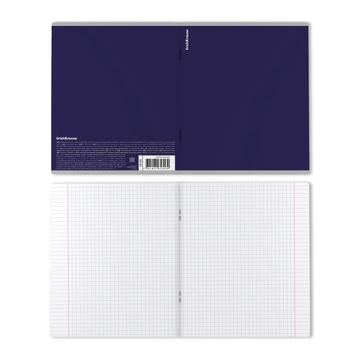 Тетрадь общая ученическая формата А5+ (170x203 мм). Двойная обложка: внешняя выполнена из высококачественного износостойкого прозрачного пластика с фактурой «апельсиновая корка», внутренняя — из качественной мелованной бумаги. В блоке 48 листов в клетку. Бумага офсетная плотностью 60 г/м2. Цвет линовки — синий. Скругленные уголки обложки и блока. Тип скрепления — скоба.