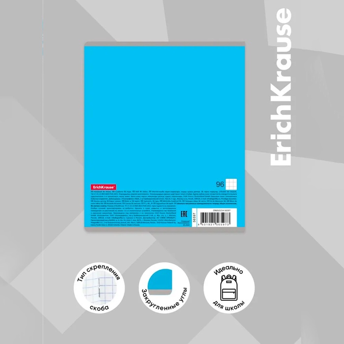 Тетрадь общая формата А5+ (170х203 мм). Обложка из высококачественного мелованного картона плотностью 190 г/м2. В блоке 96 листов в клетку с полями. Бумага офсетная плотностью 60 г/м2. Цвет линовки - синий. Скругленные уголки обложки и блока. Тип скрепления - скоба. Тетради разных цветов упакованы в термоусадочную пленку по 5 штук.