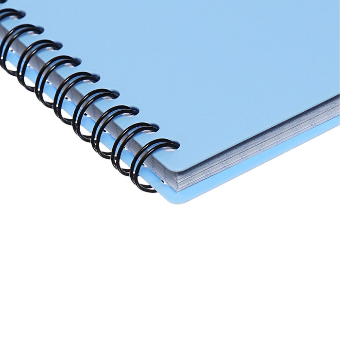 Тетрадь общая формата А5 (148x210 мм). Обложка из высококачественного износостойкого пластика с фактурой "песок". В блоке 80 листов в клетку. Бумага офсетная плотностью 60 г/м2. Цвет линовки - синий. Скругленные уголки обложки. Тип скрепления - спираль. Тетради упакованы в термоусадочную пленку по 4 штуки.